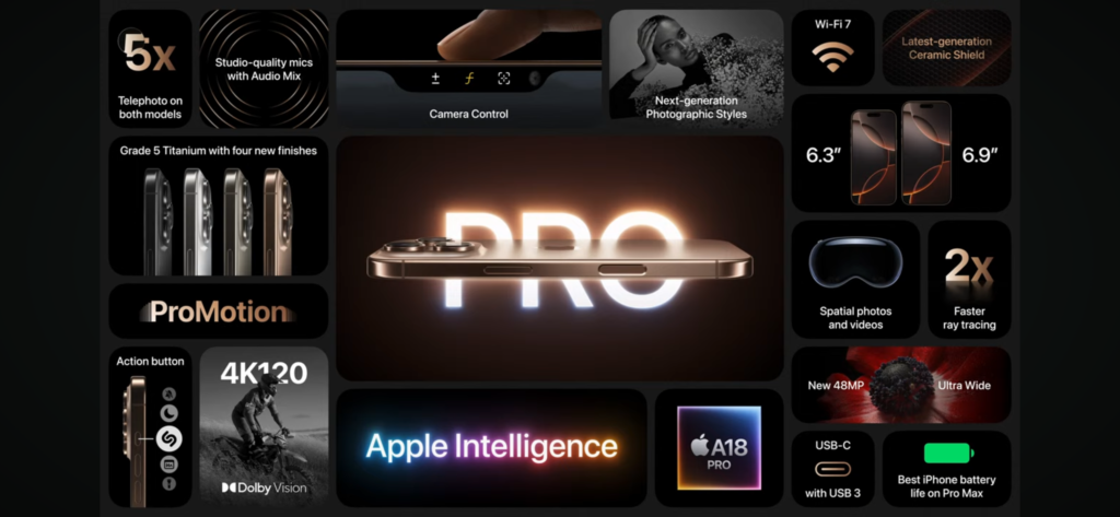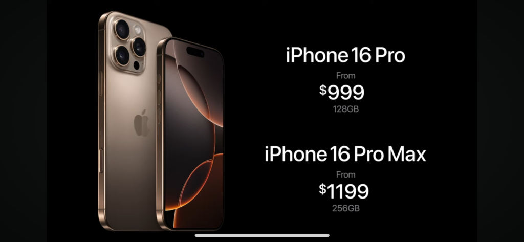ആപ്പിൾ വാച്ച് സീരീസ് 10, അൾട്രാ 2, എയർപോഡ്സ് 4 എന്നിവയും ഇവന്റിൽ പ്രഖ്യാപിച്ചു.48എംപി പ്രധാന ക്യാമറയും പുതുതായി ചേർത്ത 48എംപി അൾട്രാ വൈഡ് ക്യാമറയും ഐഫോണിന്റെ സവിശേഷതയാണ്.120 FPS ൽ 4K വീഡിയോ റെക്കോർഡിങ്,പുതിയ A18 ചിപ്പുകൾ എന്നിവയും പുതിയ ഉത്പന്നങ്ങളുടെ പ്രതേകതയാണ്.iPhone 16 Pro ന് 999 ഡോളറാണ് അടിസ്ഥാന വില..iPhone 16 Pro MAX ന് 1,199ഡോളറും വില വരും.സെപ്റ്റംബർ 13 ന് പ്രീ-ഓർഡറുകൾ ആരംഭിക്കും, സെപ്റ്റംബർ 20 മുതൽ ഉപകരണങ്ങൾ ഷോപ്പുകളിൽ വാങ്ങാനും സാധിക്കും.